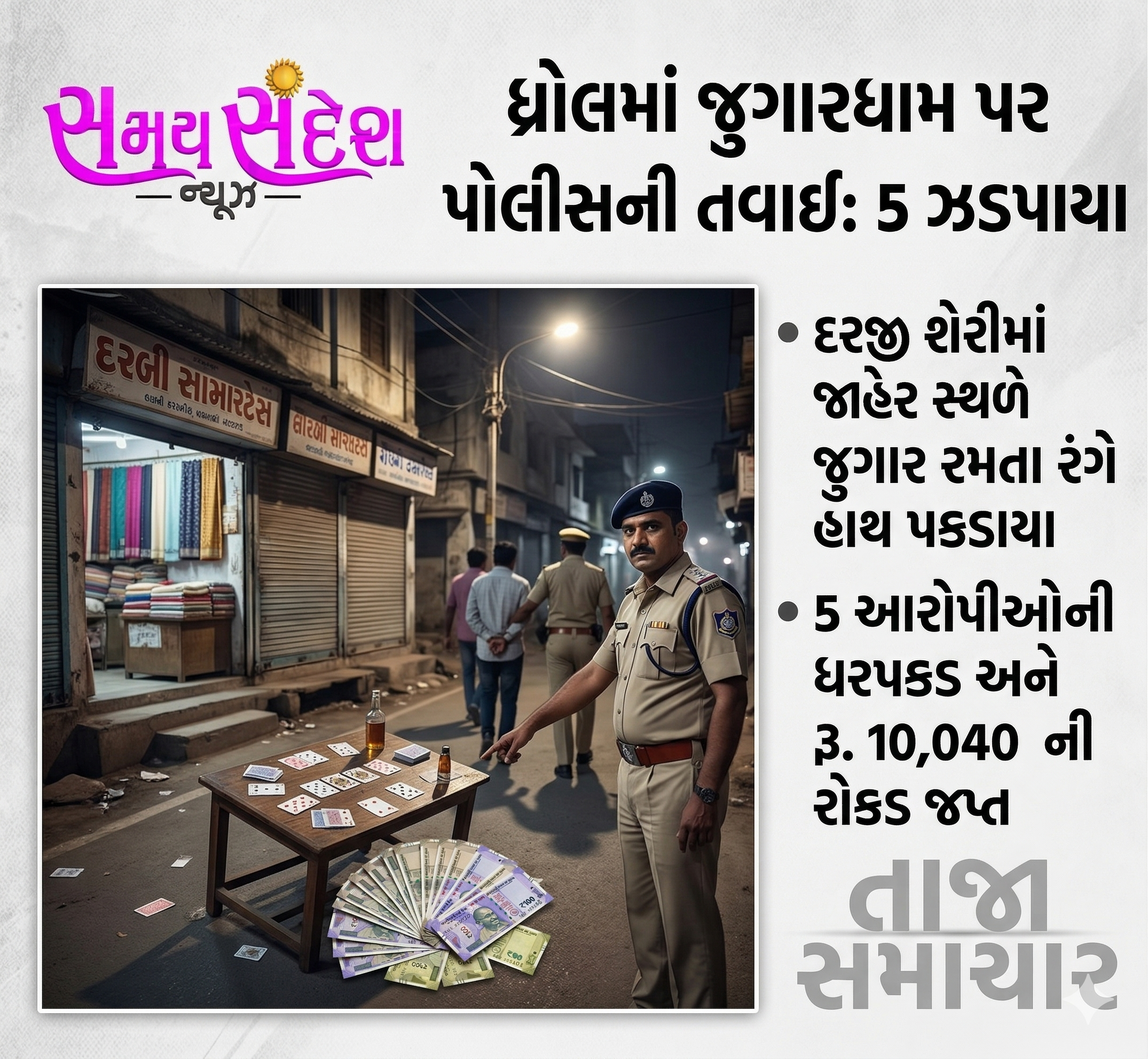 ધ્રોલમાં જુગાર પર પોલીસનો કડક પ્રહાર દરજી શેરીમાં જાહેરમાં રમતા ૫ લોકો ઝડપાયા, ₹10,040ના મુદામાલ સાથે કાર્યવાહી.