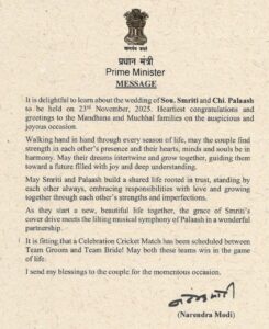ભારતીય મહિલા ક્રિકેટની સૌથી સ્ટાઇલિશ, સૌથી કોન્સિસ્ટન્ટ અને વર્લ્ડ-ક્લાસ બેટર્સમાંની એક સ્મૃતિ માન્ધના ક્રિકેટલોકમાં મેગાસ્ટાર છે. બીજી તરફ, પલાશ મુચ્છલ—ઇન્દોરનો 30 વર્ષનો સંગીતકાર, કોમ્પોઝર અને સામાજિક કાર્યોમાં સક્રિય નામ.