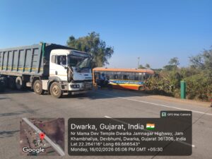 ખંભાળિયા–જામનગર હાઈવે પર દાંતા ગામ નજીક આજે વહેલી સવારે થયેલા માર્ગ અકસ્માતમાં ત્રણ લોકો ઇજાગ્રસ્ત બન્યા હોવાની માહિતી સામે આવી છે. બ્રેકડાઉન થયેલી ST બસને પાછળથી ટ્રકે ટક્કર મારતા આ અકસ્માત સર્જાયો હતો. ઘટનામાં બસની રીપેરિંગ કરી રહેલા બે કારીગર અને બસના કંડક્ટરને ઇજાઓ પહોંચી હતી.