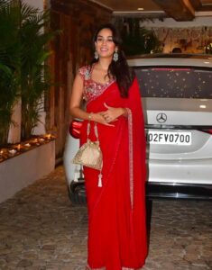 શાહિદ કપૂરની પત્ની મીરા કપૂર હંમેશા ફૅશનનું નવું ધોરણ નિર્ધારિત કરે છે. આ વખતે પણ તેમણે સાબિત કર્યું કે “Less is more.” મીરાએ લાલ સાડી સાથે ગોલ્ડન ઝુમકા અને કલીન મેકઅપ લૂક પસંદ કર્યો હતો. તેમના સાડીનો ફેબ્રિક સિલ્કી અને હળવો હતો, પરંતુ તેમાં ભરતકામની નાજુક કારીગરી જોવા મળતી હતી. સાડીની ઘેરી બોર્ડર અને બ્લાઉઝના ડિઝાઇનમાં સંયમ અને સ્ટાઇલ બંને દેખાતા હતા. મીરાના હાથમાં ચુડીઓ અને કાચના બંગડીઓ સાથે એકદમ પરંપરાગત ફિનિશિંગ ટચ જોવા મળ્યો.