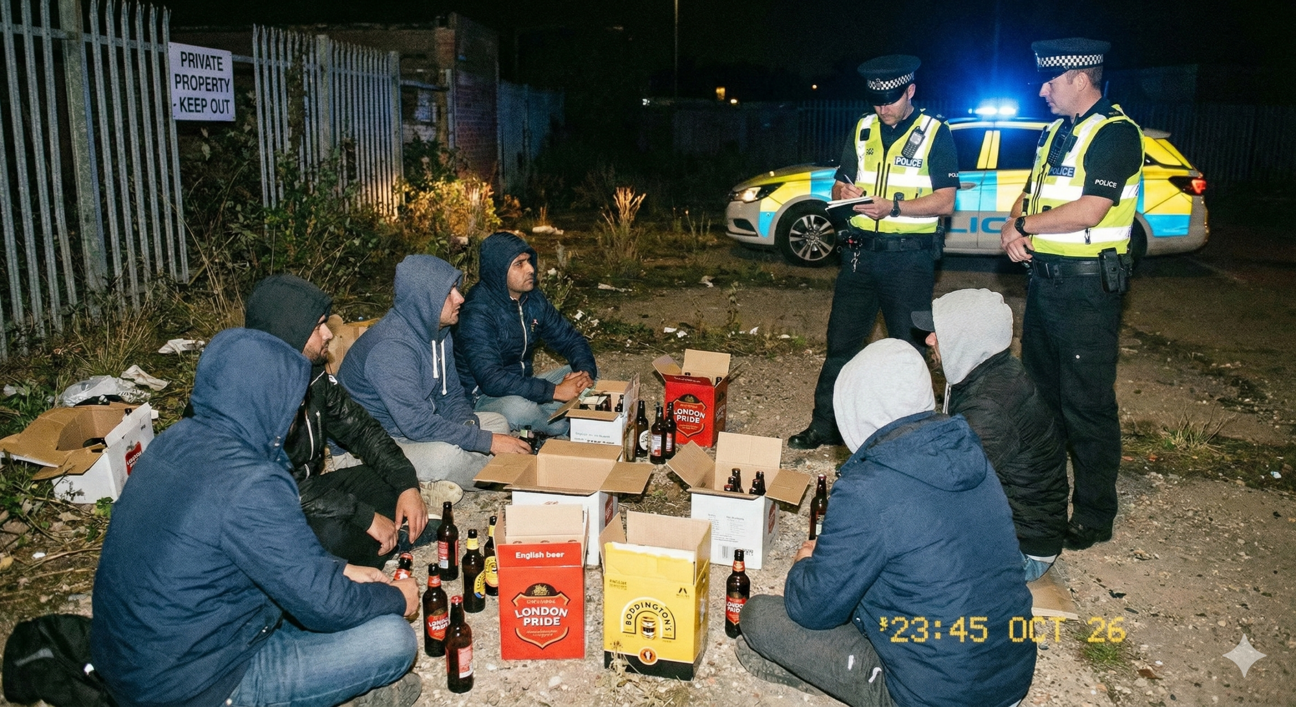 પોલીસને મળેલી ચોક્કસ બાતમીના આધારે શહેરના એક ખાલી પડેલા પ્લોટ વિસ્તારમાં રેડ પાડવામાં આવી હતી. ત્યાં ગ્રે કલરની મારૂતી સુઝુકી કંપનીની અર્ટીગા કાર (રજી.નં. GJ 10 DE 4069) પાર્ક કરવામાં આવી હતી. કારની આસપાસ પાંચ યુવાનો ભેગા મળી બિનપરમિટ Budweiser Magnum Premium Beer ના ટીનના કેન સાથે દારૂ પીતા હોવાનું જોવા મળ્યું હતું.