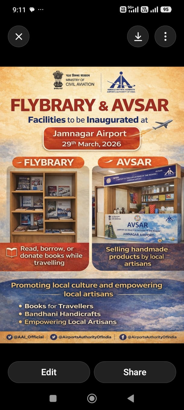 જામનગર એરપોર્ટ પર નવી પહેલ — ‘ફ્લાયબ્રેરી’ અને ‘અવસર’ સાથે યાત્રિકોને મળશે વાંચન અને સ્થાનિક કળાનો અનોખો અનુભવ.