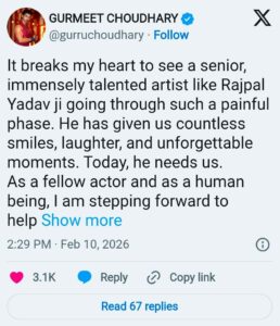 “રાજપાલ યાદવ જેવા વરિષ્ઠ અને પ્રતિભાશાળી કલાકારને આ સ્થિતિમાંથી પસાર થતા જોવું દુઃખદ છે. તેમણે અમને અસંખ્ય સ્મિત અને અવિસ્મરણીય ક્ષણો આપી છે. આજે તેમને આપણી જરૂર છે.”