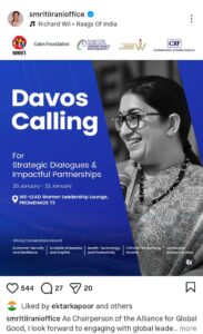 સ્મૃતિ ઈરાની માત્ર રાજકારણ સુધી સીમિત નથી, પરંતુ સામાજિક પરિવર્તન, મહિલા સશક્તિકરણ અને લિંગ સમાનતાના વૈશ્વિક અભિયાનમાં તેઓ એક સક્રિય અને પ્રભાવશાળી અવાજ બની ચૂક્યા છે. દાવોસ 2026માં તેમની હાજરી ભારત માટે માત્ર પ્રતિનિધિત્વ નહીં, પરંતુ વિચાર નેતૃત્વ (Thought Leadership)**નું પ્રતીક બનશે.