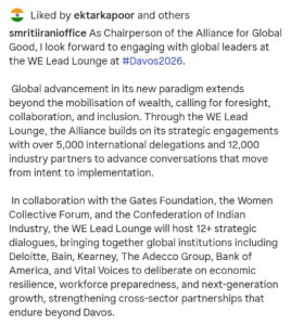 સ્મૃતિ ઈરાની, ઍલાયન્સના અધ્યક્ષ તરીકે, 20 થી 22 જાન્યુઆરી 2026 દરમિયાન દાવોસમાં યોજાનારી WE Lead Loungeની બેઠકોમાં વૈશ્વિક નેતાઓ સાથે વ્યૂહાત્મક સંવાદ કરશે.