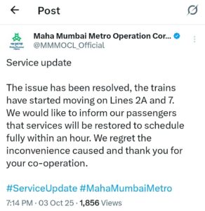 આ ઘટના પછી ફરી એકવાર મુંબઈ મેટ્રોની વિશ્વસનીયતા અને સંદેશાવ્યવહારની પદ્ધતિ પર પ્રશ્નો ઊભા થયા છે.