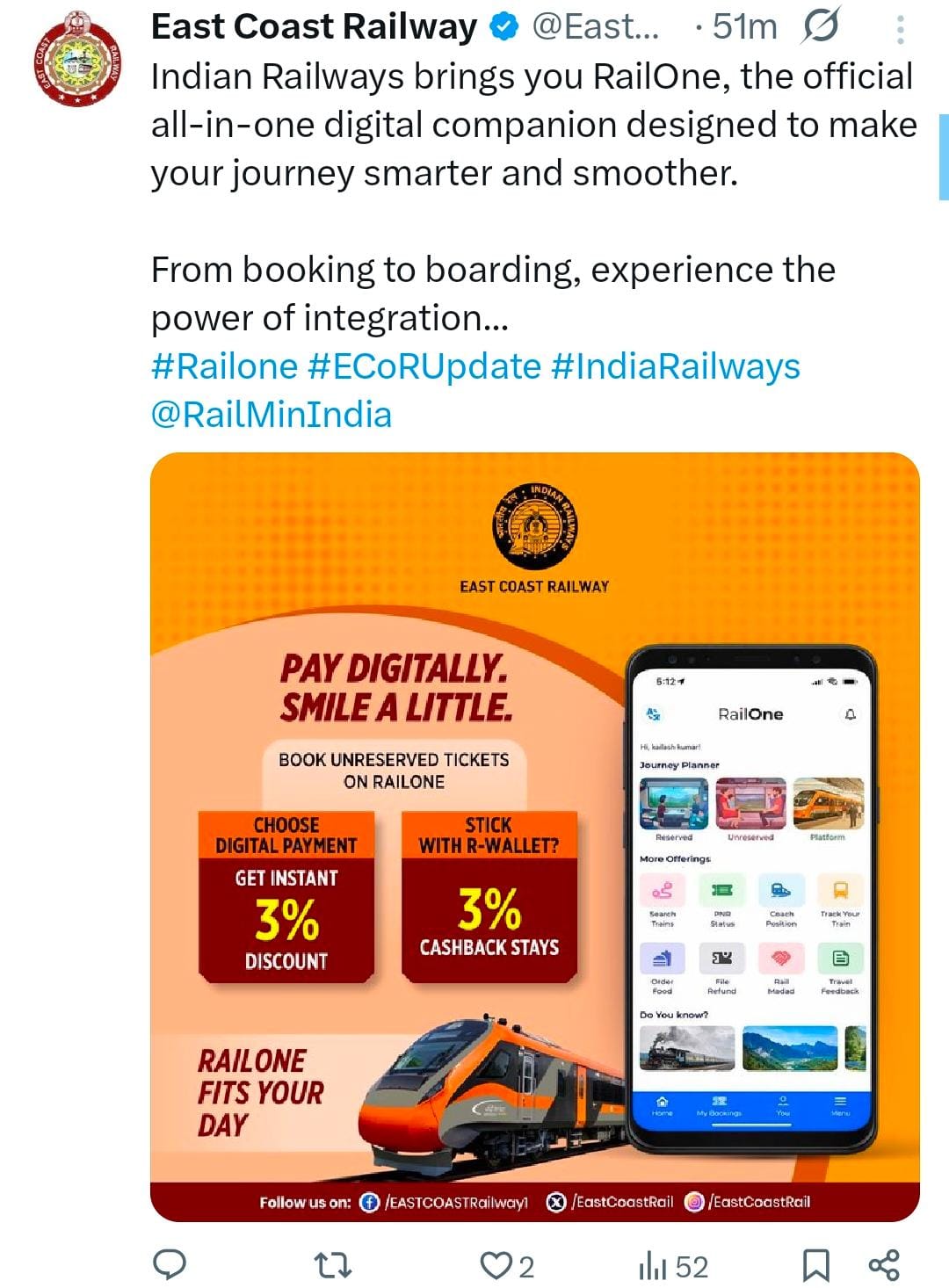રેલવેના અધિકારીઓ અનુસાર RailOne એપ: