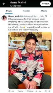 • ધર્મેન્દ્રની પત્ની હેમાં માલિનીએ એક સોશિયલ મીડિયા પોસ્ટમાં ફેન્સને વિનંતી કરી કે તેઓ ‘પપ્પાની ત્વરિત આરોગ્ય-ઉપચાર માટે’ પ્રાર્થના કરે. FilmiBeat+1