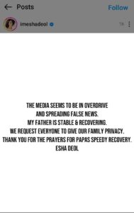 • પરંતુ ટૂંક સમયમાં જ ધર્મેન્દ્રની દીકરી એશા દેઓલે તેના ઇન્સ્ટાગ્રામ પોસ્ટમાં કહ્યું: “મિડિયા વધારે કામ કરી રહ્યું છે અને ખોટા સમાચાર ફેલાવી રહ્યું છે. મારા પિતાની હાલત સ્થિર છે અને તેઓ સ્વસ્થ થઈ રહ્યા છે.” Goodreturns+1